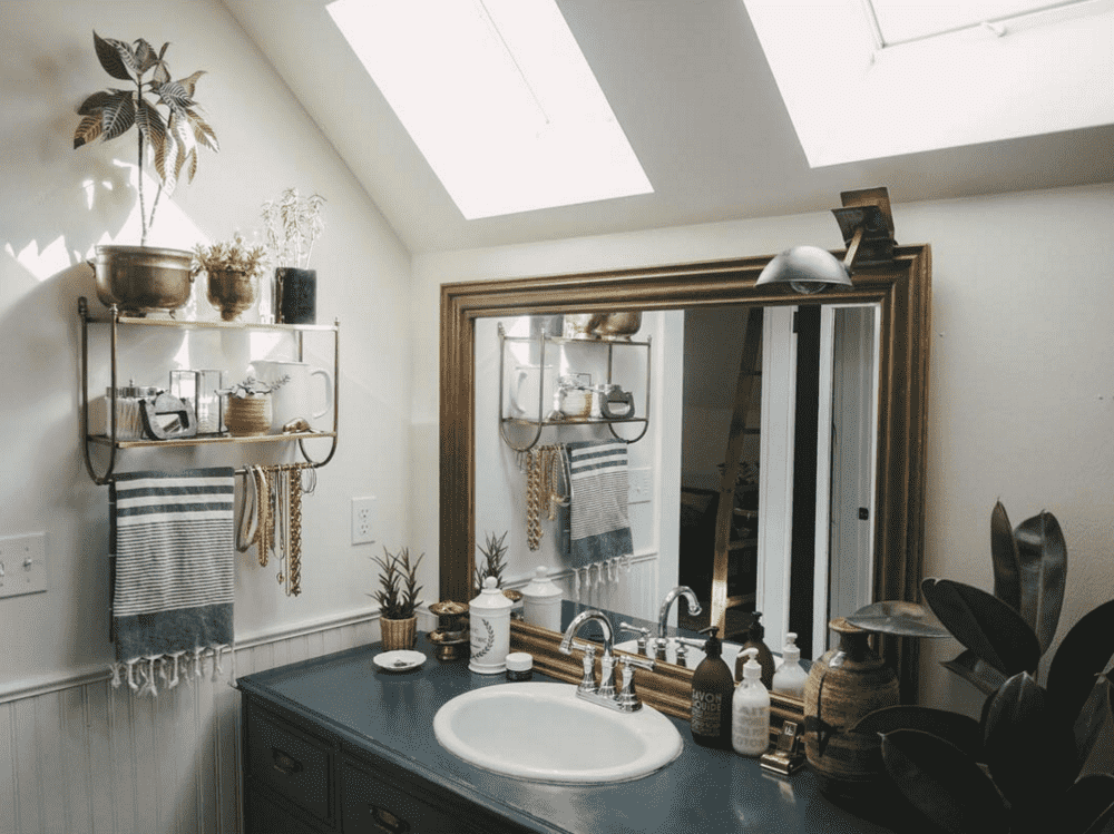 The photo shows a bathroom in a private house with windows in the ceiling. The interior is decorated with fresh flowers and decorative trifles.