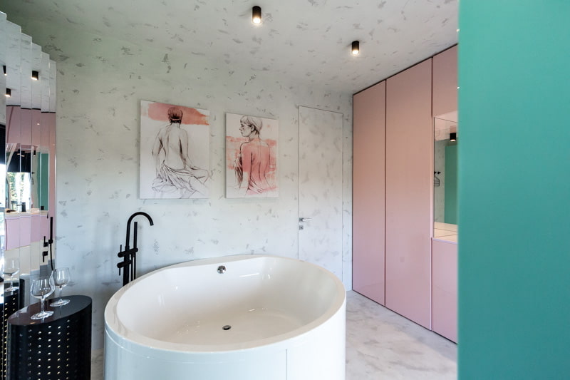 This idea of bathroom decor may seem strange, but the experience of foreign designers shows that paintings and photographs in bathrooms are used everywhere. The main thing is good ventilation and the absence of paper elements in wet areas.