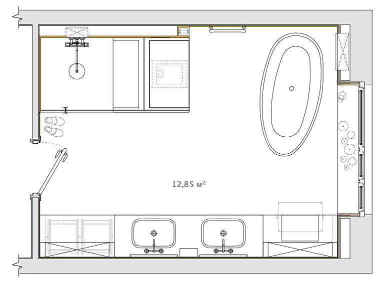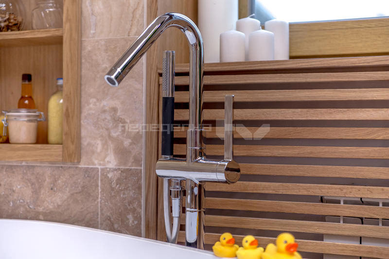 Two shower heads - one stationary and the other on a flexible hose - allow you to take your hygiene procedures with maximum comfort. Even the faucets here are not ordinary, but thermostatic: random surges in pressure, pouring over users with hot or cold water, in this case will not be felt.