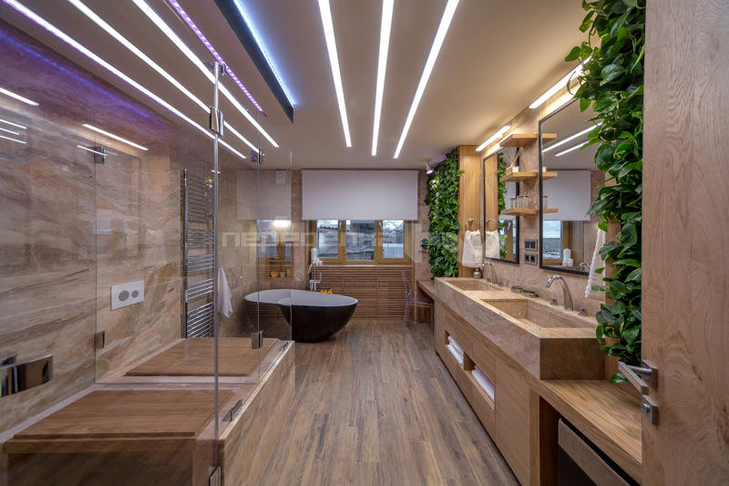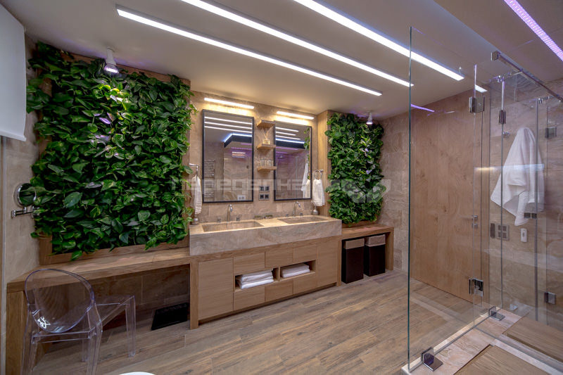 Living plants became a special highlight of the large bathroom design. They are planted in special niches, framing a group of two washbasins.