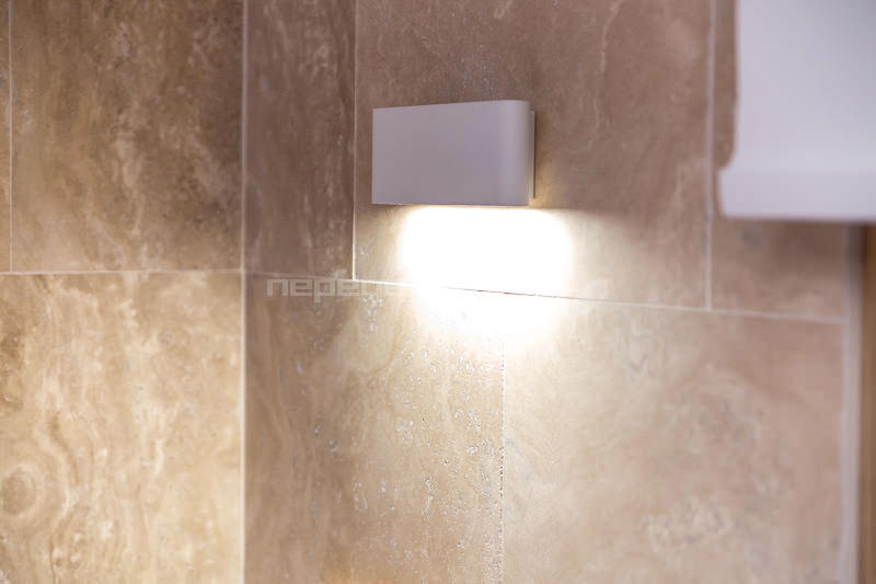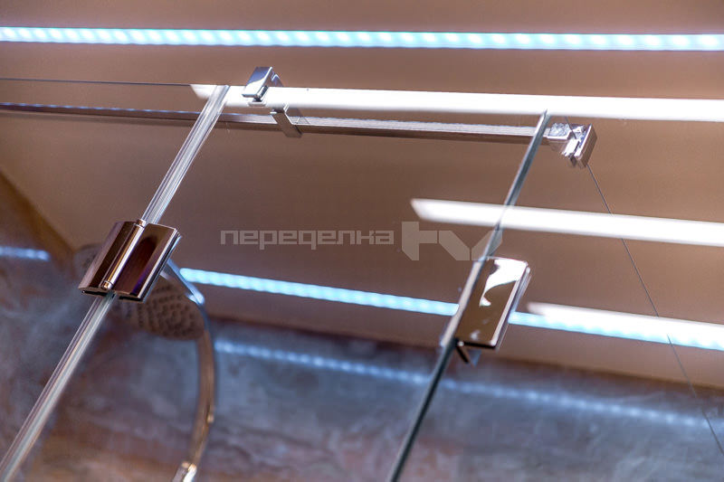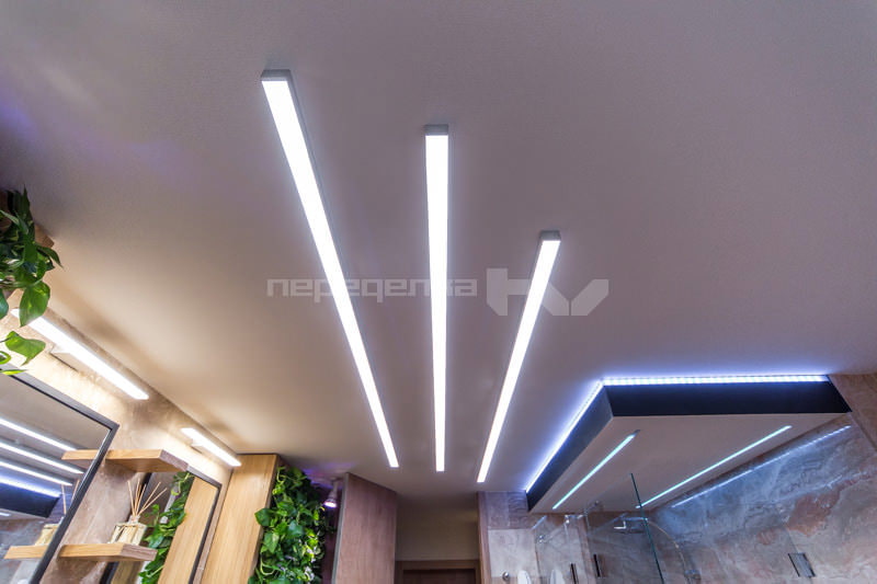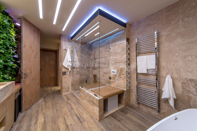 The interior of the bathroom looks natural and beautiful largely thanks to thoughtful lighting: LED strips, covered with matte plastic on top, simulate diffused daylight.