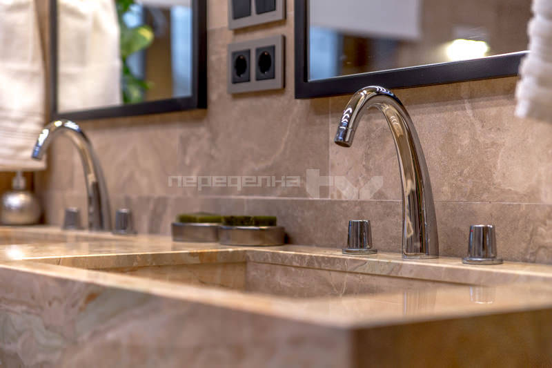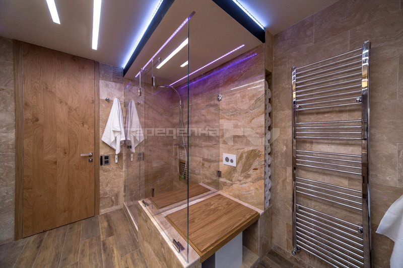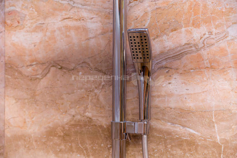 The shower room is finished with natural marble from Italy. This is a fairly durable moisture resistant material that is not afraid of temperature jumps. The mechanical stability of marble is quite sufficient for a given room, and if small defects suddenly appear, they can be polished.