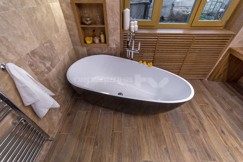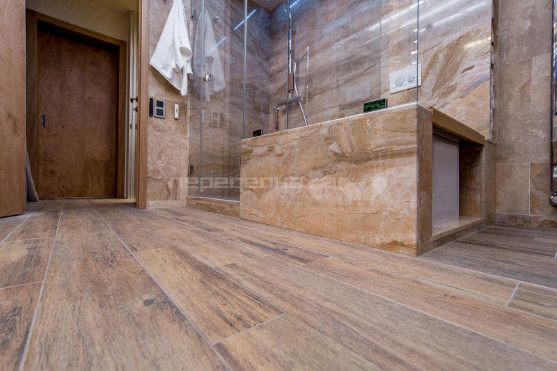 To keep the bathroom warm and comfortable, the floors were made with water heating. Wood-like porcelain stoneware floors provide durability, water resistance, and at the same time give the room a warm atmosphere, in this case - not only visually.