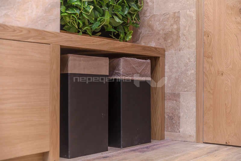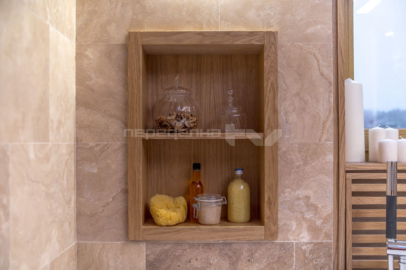 In the design of the large bathroom, pine is also used - benches are made of it: one is in the shower, and the other covers the top of the toilet. They are also finished with oak veneer to blend in with the rest of the furniture.