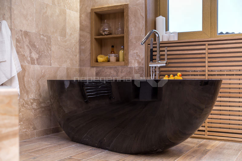 The main decorative accent of a beautiful bathroom interior is a black and white bath bowl. This is an exclusive item made of marble chips, bonded with a polymer composition. Such material does not conduct heat well, due to which the water in the bath will have a comfortable temperature for a long time.