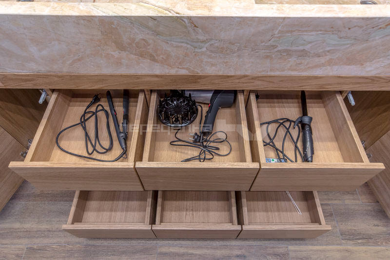 All furniture is made of chipboard. In drawers you can store everything you need - towels, cosmetics. Finishing - natural oak veneer. To protect the tree from moisture, it was varnished on top in several layers.