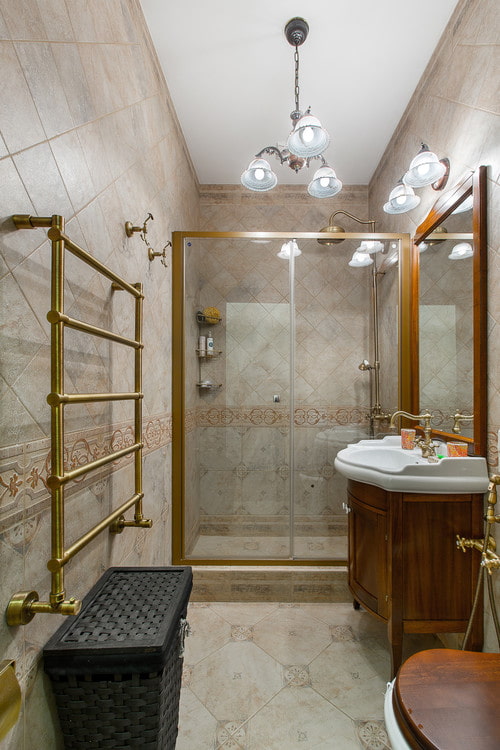 - Glass. It creates a transparent, reflective surface that expands the room. It can be present in the form of a shower cubicle partition, cabinet doors, shades.