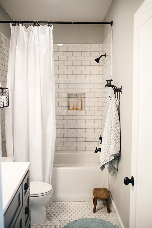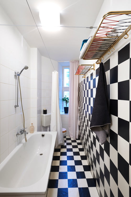 - Contrast curtain. This technique is for the same bathroom layout as in the previous paragraph. Even an open curtain will help to achieve a more harmonious effect of space.