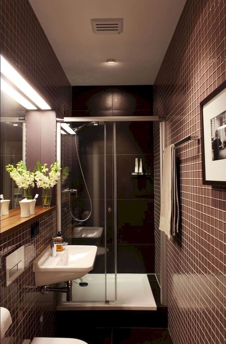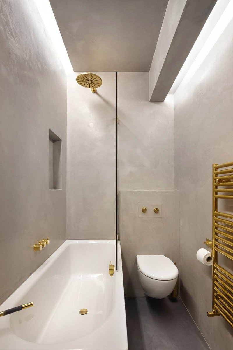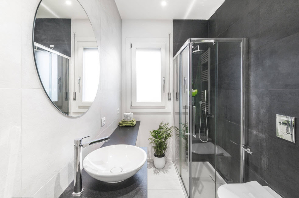 - Dark color in the wet area. If you are installing the bathroom on the far short wall, make the material a few shades darker than the main one. The wall will look closer.