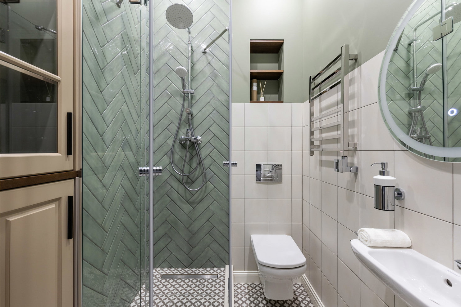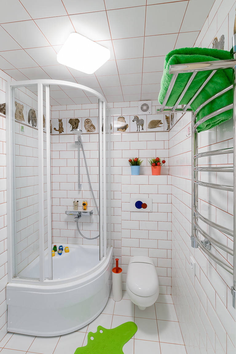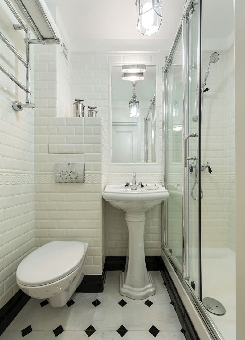 Walls... Most often, glossy tiles, porcelain stoneware, paint, pvc panels are used in the decoration. Wallpaper can only be glued in the upper part, away from the shower.In narrow rooms, use stretched tiles or panels, laying them horizontally - this will push the walls apart. For an environment with the correct geometry, squares and honeycombs are suitable. Mosaic in soothing colors looks especially good. A win-win project: plain tiles with colored borders.
