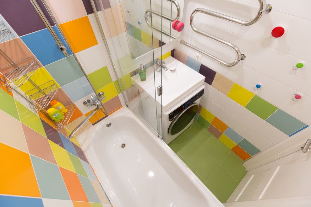 If possible, take the washing machine to the kitchen or corridor, but if this is not possible, purchase a miniature narrow model for the bathroom with an area of 3 square meters.Install it under the sink or on the side of the bathtub or shower, hanging several spacious shelves above it.