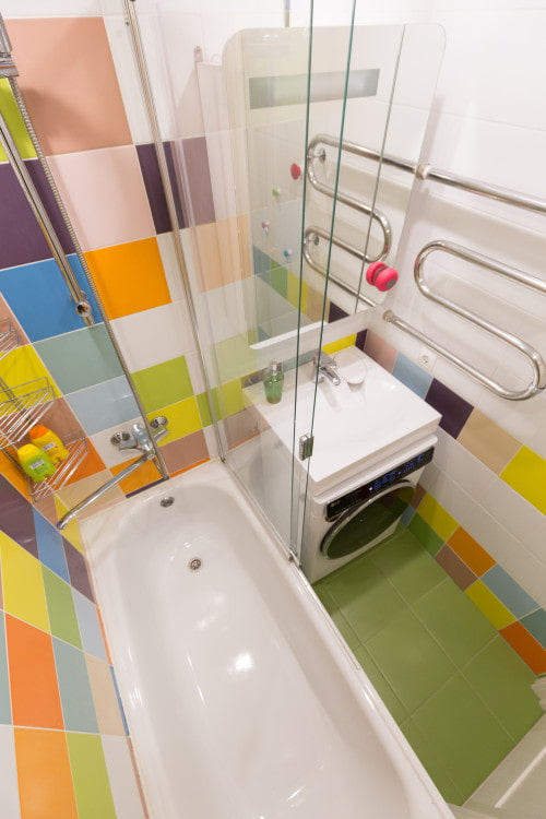 If the geometry of the room allows, the bath is installed from wall to wall to the side of the entrance - so it takes up less space and you have enough space to organize other zones. To save space in the bathroom, replace the bowl with a shower cabin - you win at least 80 * 80 cm and you can install a washing and drying machine in the resulting void.