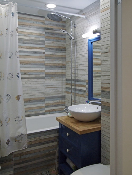 We pass to the walls. Bathroom design assumes that the coating should not only be beautiful, but also practical. Walls should not be afraid of constant humidity, water ingress, cleaning with detergents. The main contenders are porcelain stoneware or tiles, high-quality paint, decorative plaster, PVC panels. It is better to forget about using wallpaper or lining - in a small bathroom, water gets everywhere, so avoid hydrophobic materials.