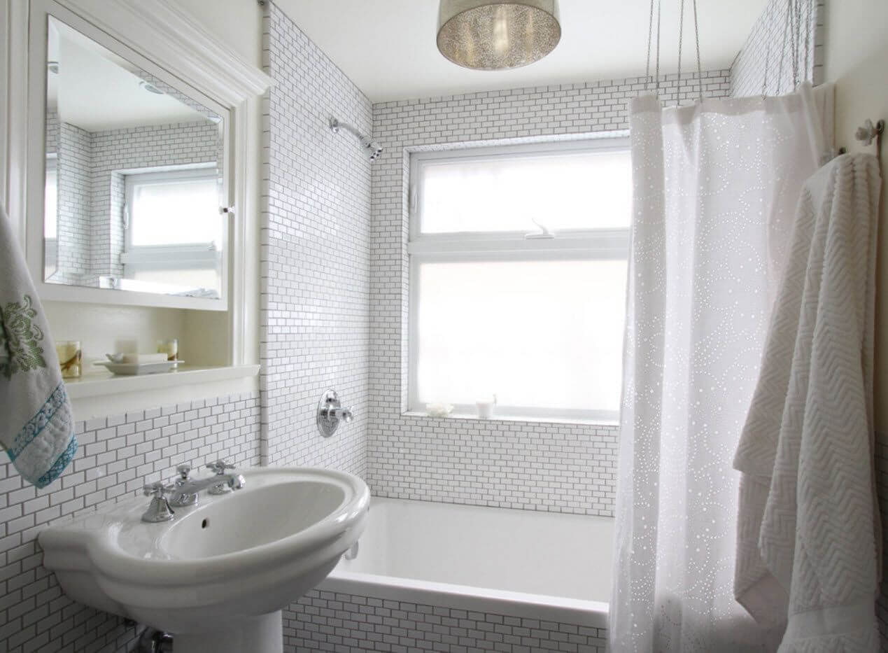 In the photo there is a white interior with small tiles on the walls.
