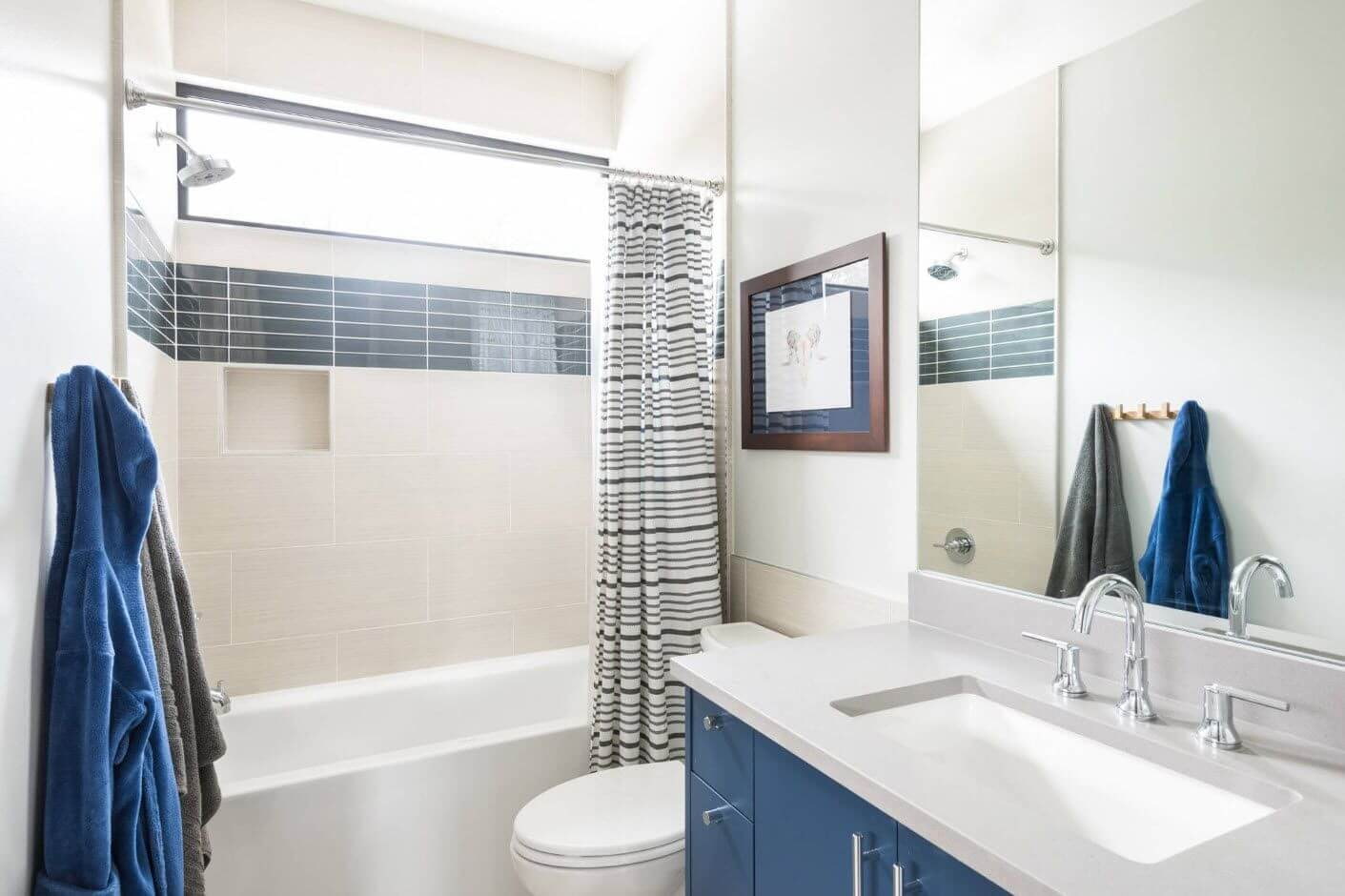 In the photo, a combined bathroom in a blue palette