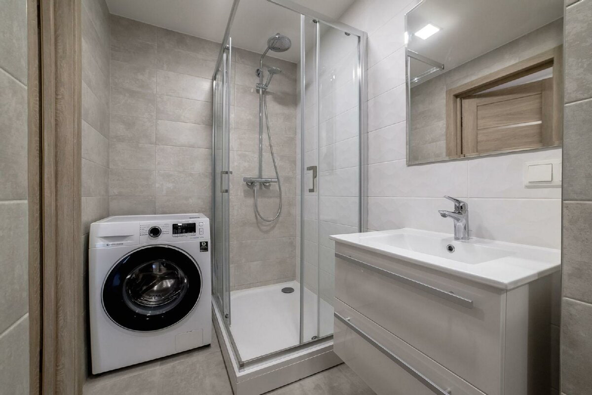 You will not have a separate place for the washing machine (the exception is near the shower stall). Place the appliance under the countertop, not forgetting about the vibration gaps of 2-3 cm on the sides and ~ 2 cm on top.