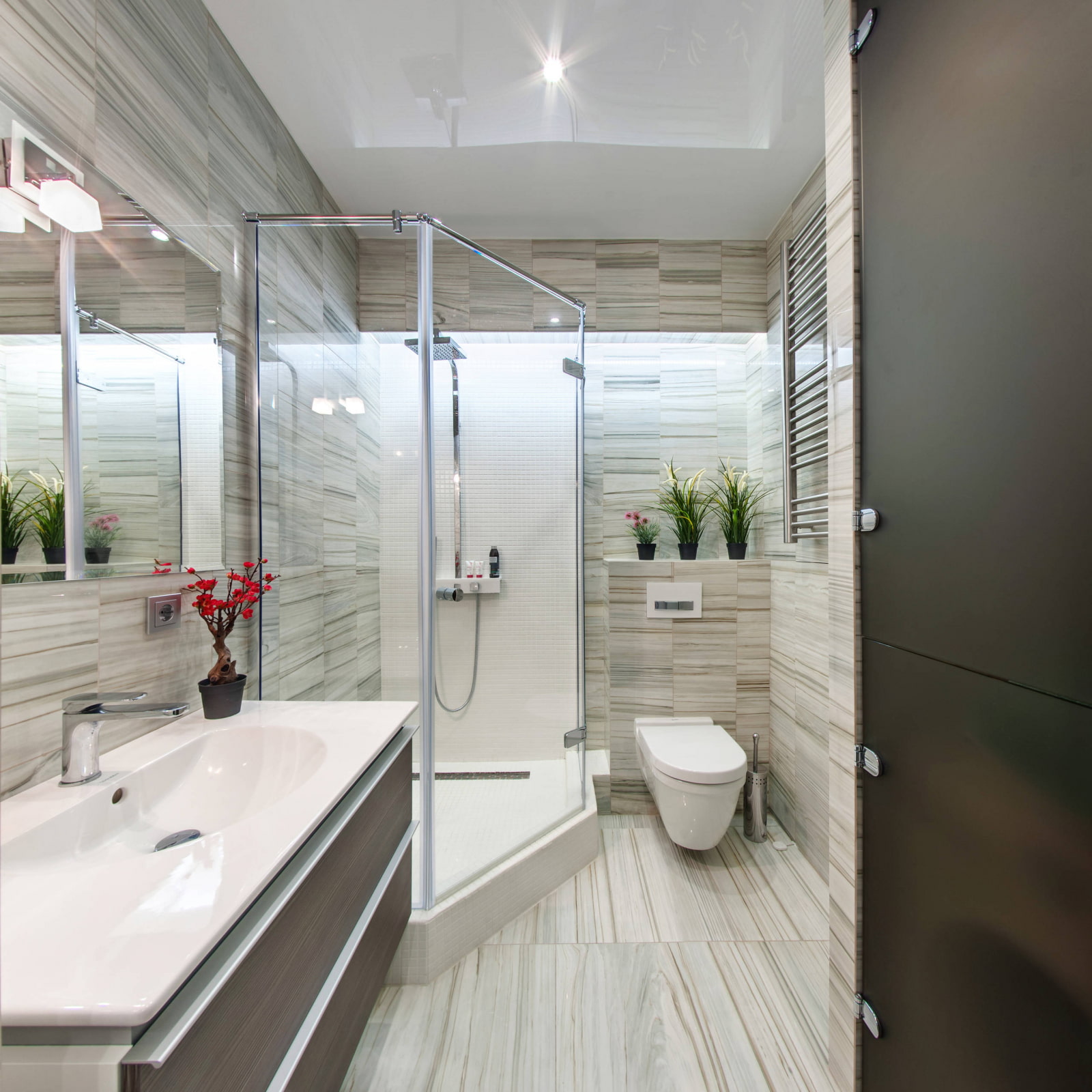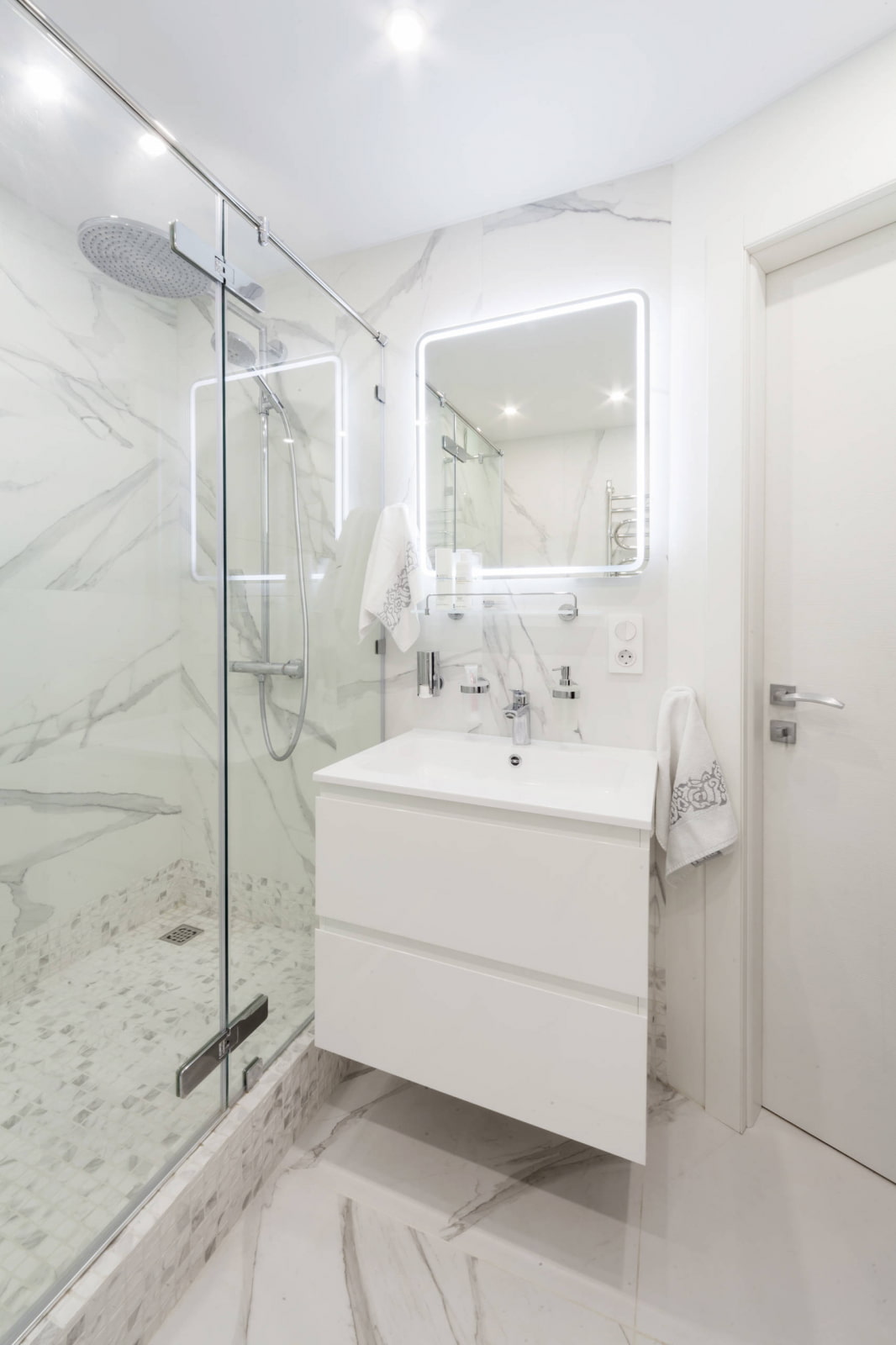 The light intensity depends on the size of the room. Lamps must be placed on the ceiling, in the shower area, and also near the mirror.
