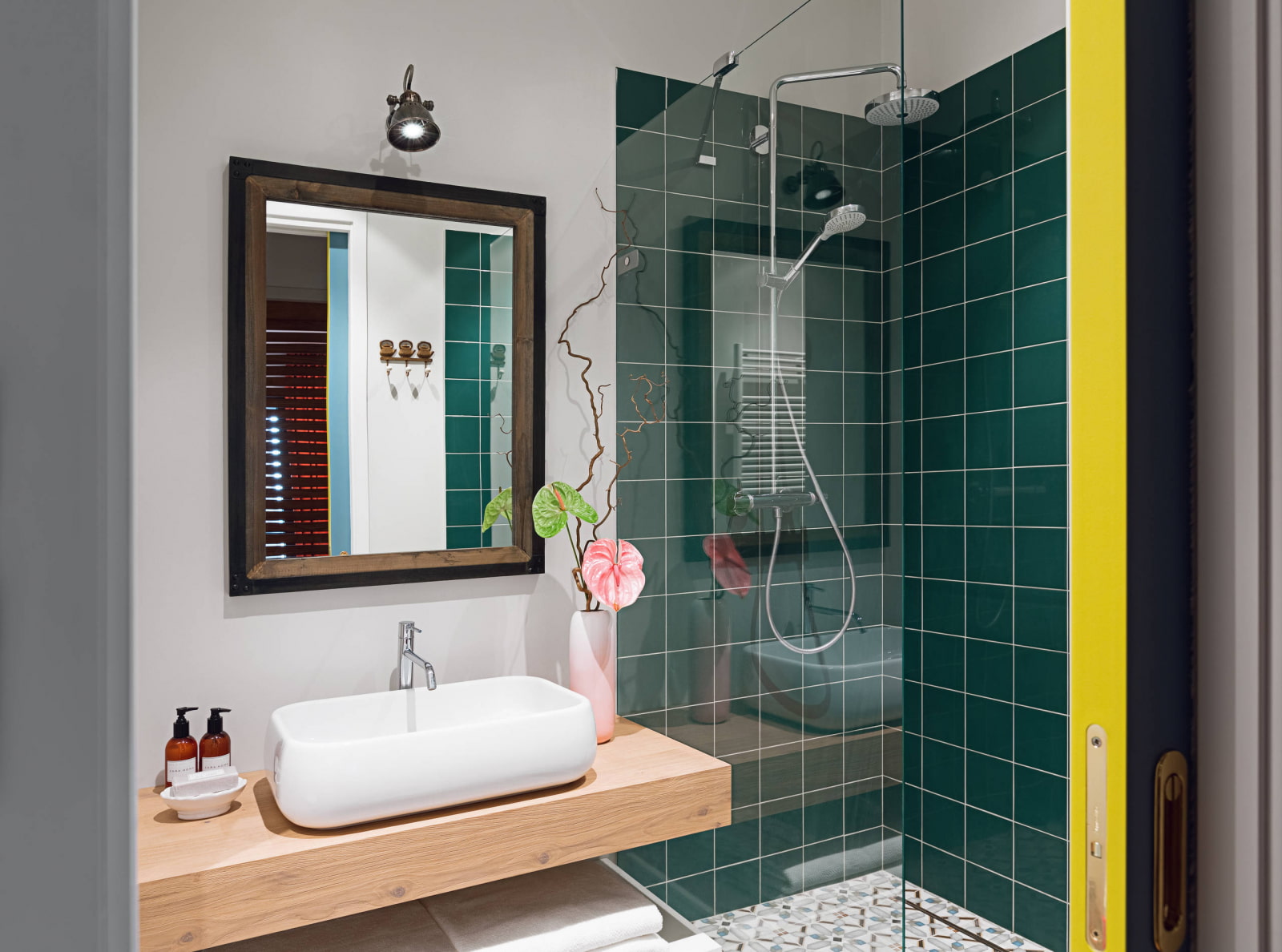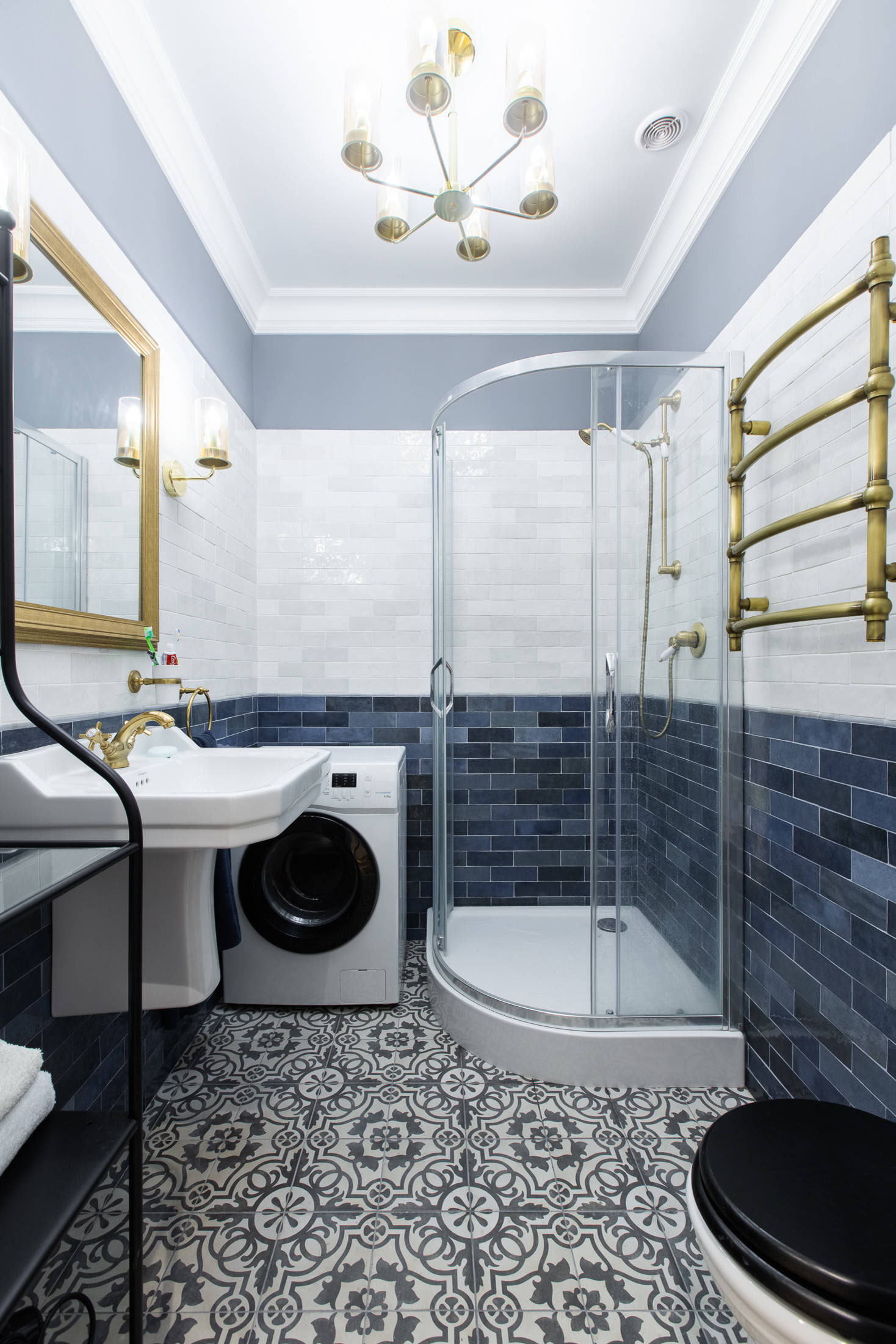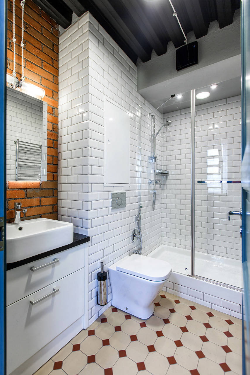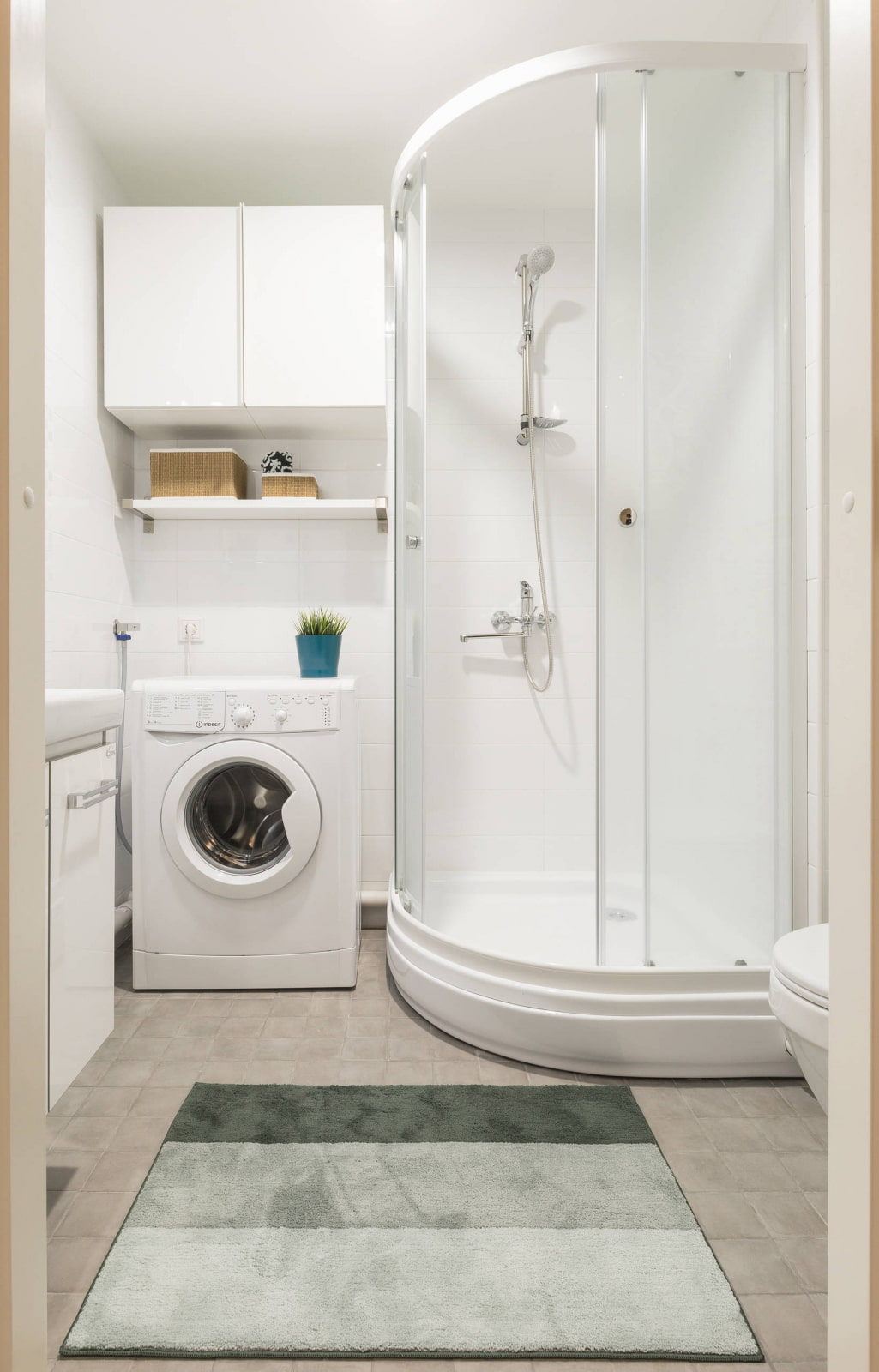 The layout of the small room allows the cabin to be positioned in a corner to save as much floor space as possible: this frees up space for the washing machine, sink and laundry basket.