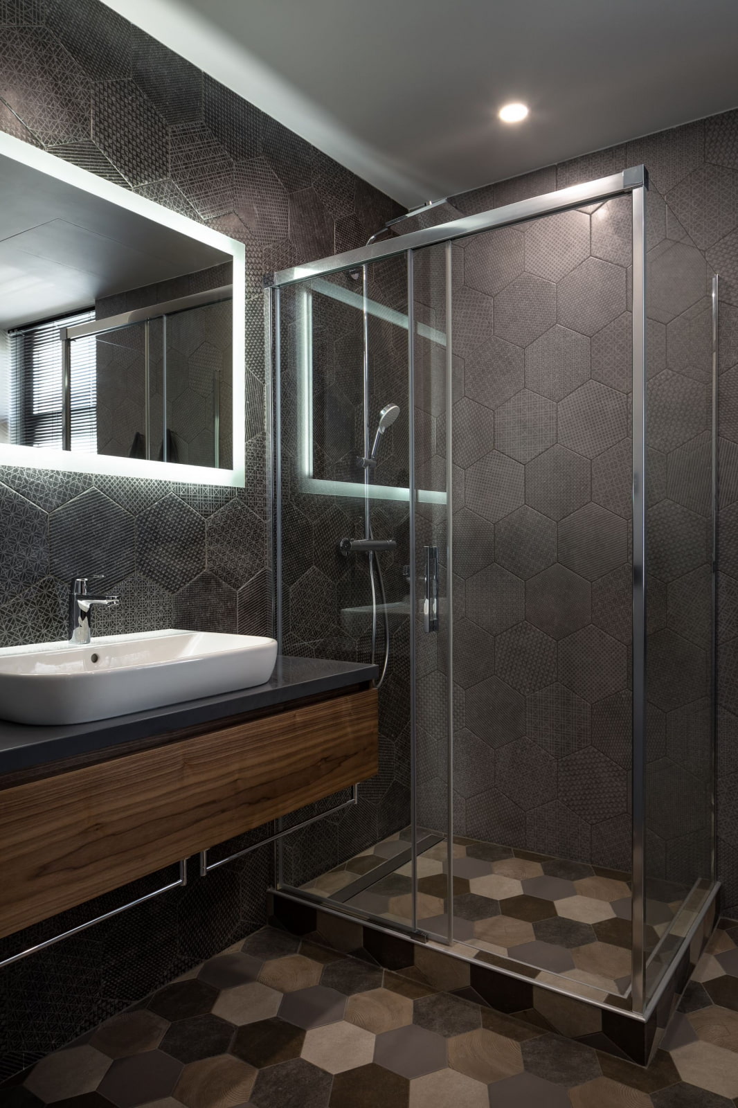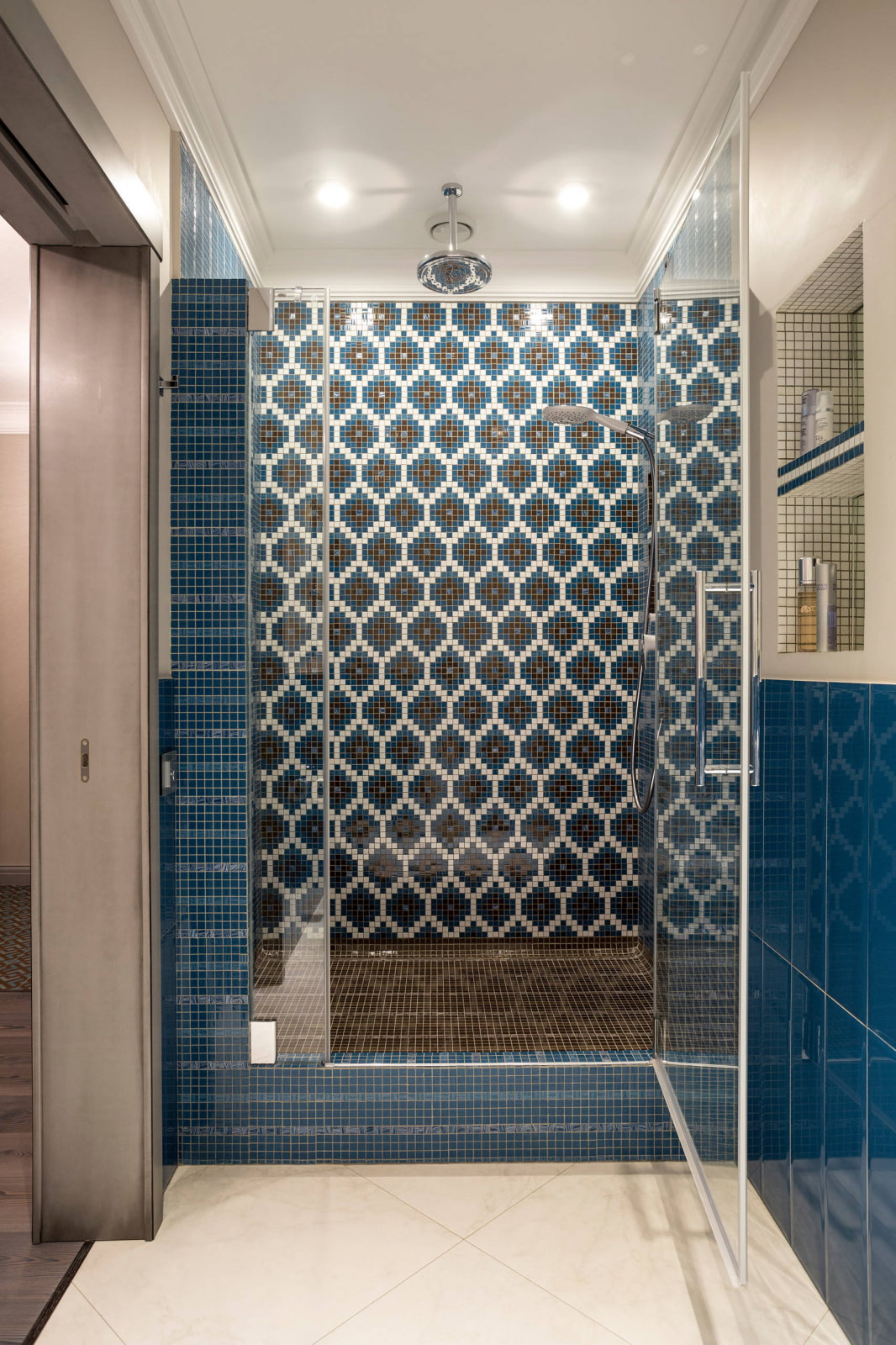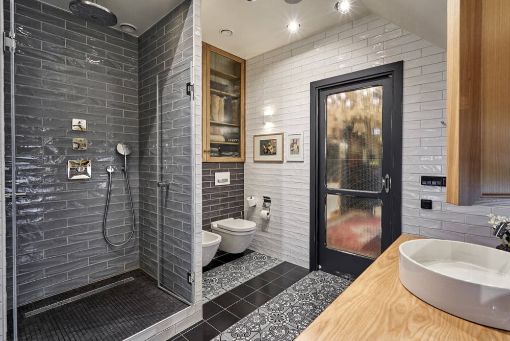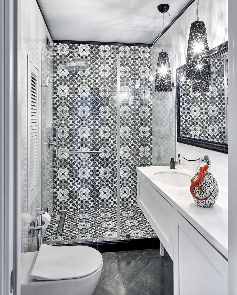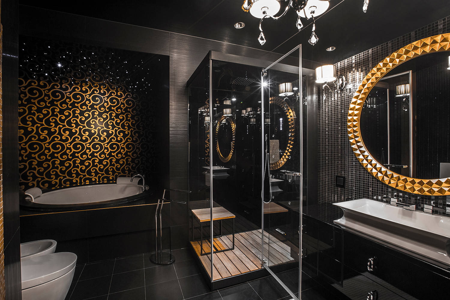 The photo shows a luxurious bathroom with a shower, trimmed with black tiles with a pattern and patina.