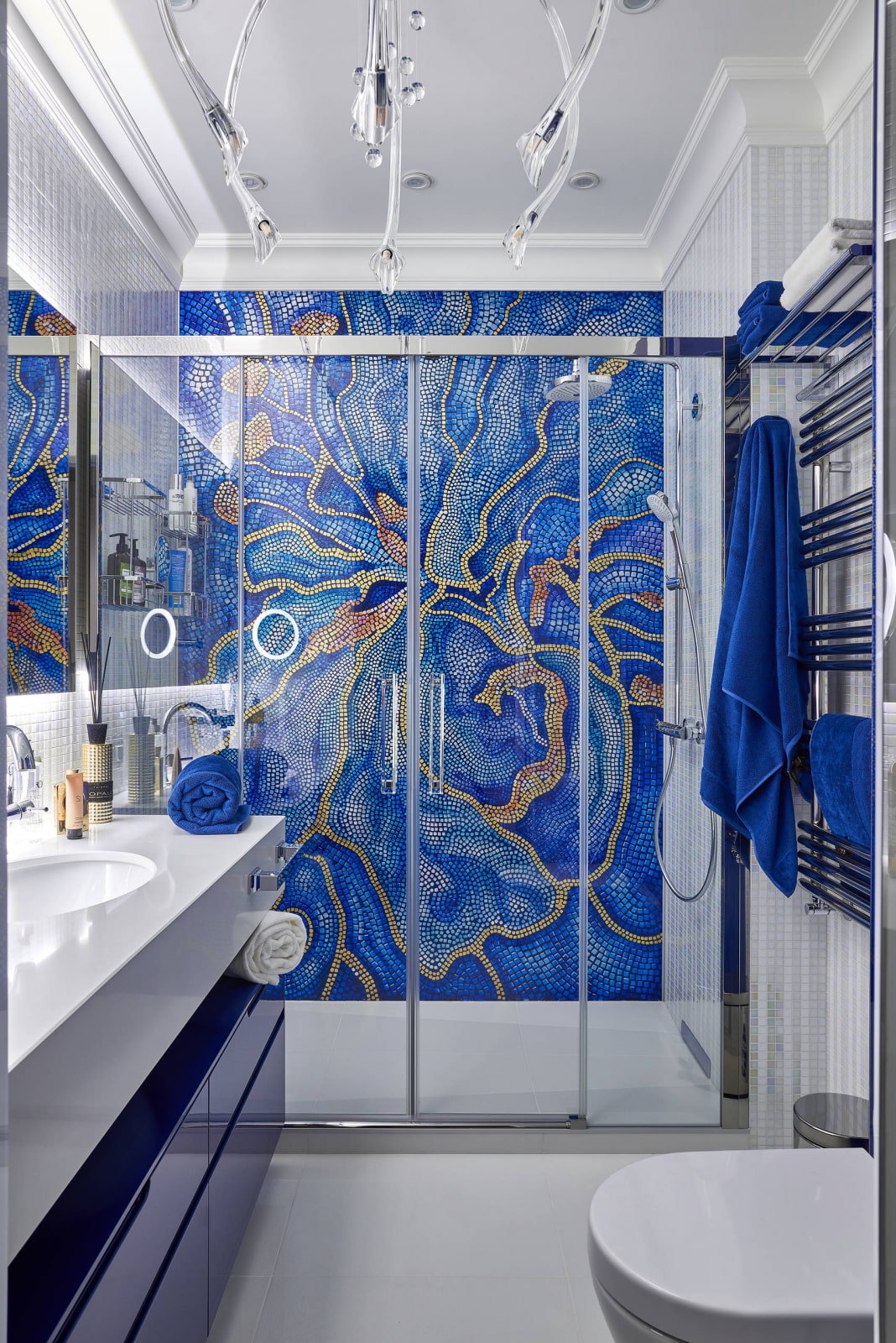 In addition to tiles, ceramic or mirror mosaics are used for wall cladding. It is also environmentally friendly and resistant to dirt, and the variety of shades allows you to create any pattern or geometric pattern and make your bathroom unique.