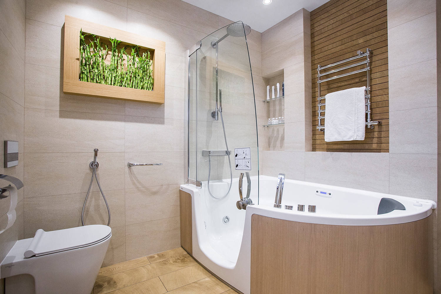 This design combines the functions of a shower and a bath: it can be either a bowl equipped with a watering can, or a full-fledged shower box with a high tray and additional equipment. Suitable only for spacious rooms, as it takes up a lot of space. There are also showers built into niches, which are closed with hinged or sliding doors.