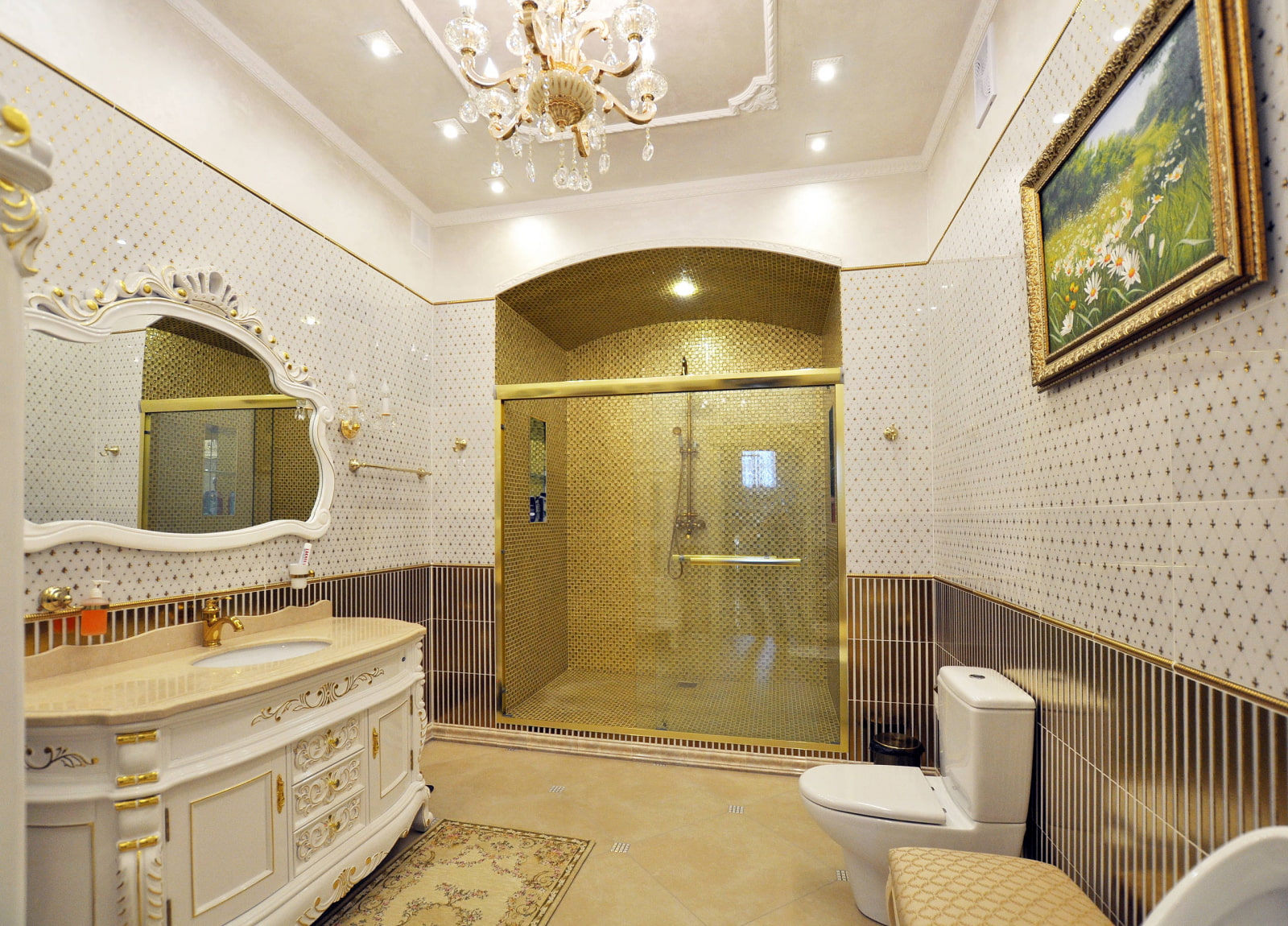 In the photo there is a classic-style bathroom, into which a shower room with a threshold fits perfectly.