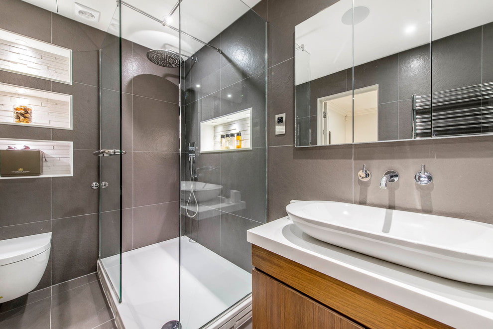 In the photo there is a bathroom in gray tones, equipped with a cabin with a glass hinged door.