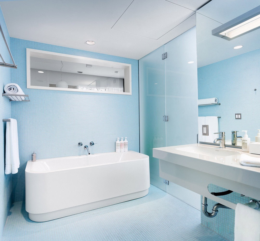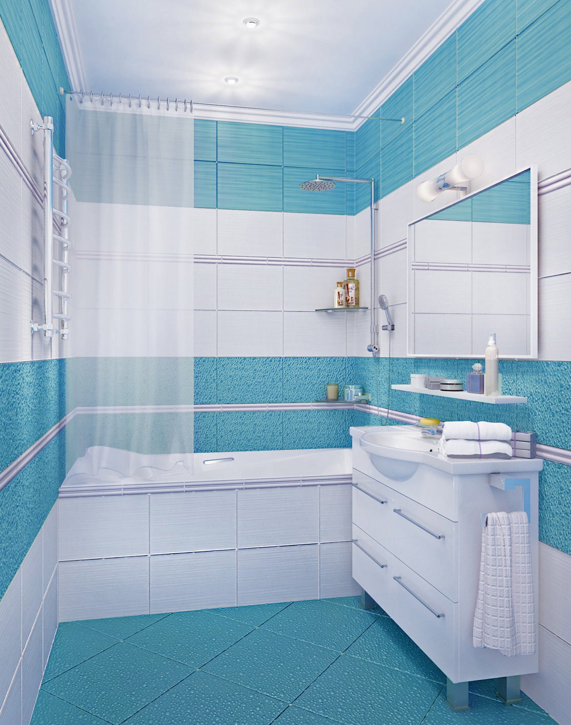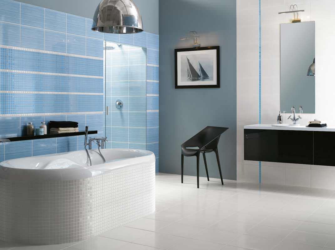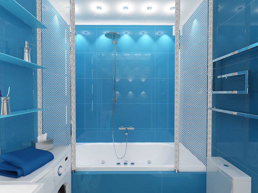 In small rooms, it is preferable to choose light, light, whitened blue shades, in large bathrooms, you can opt for thicker, darker colors.