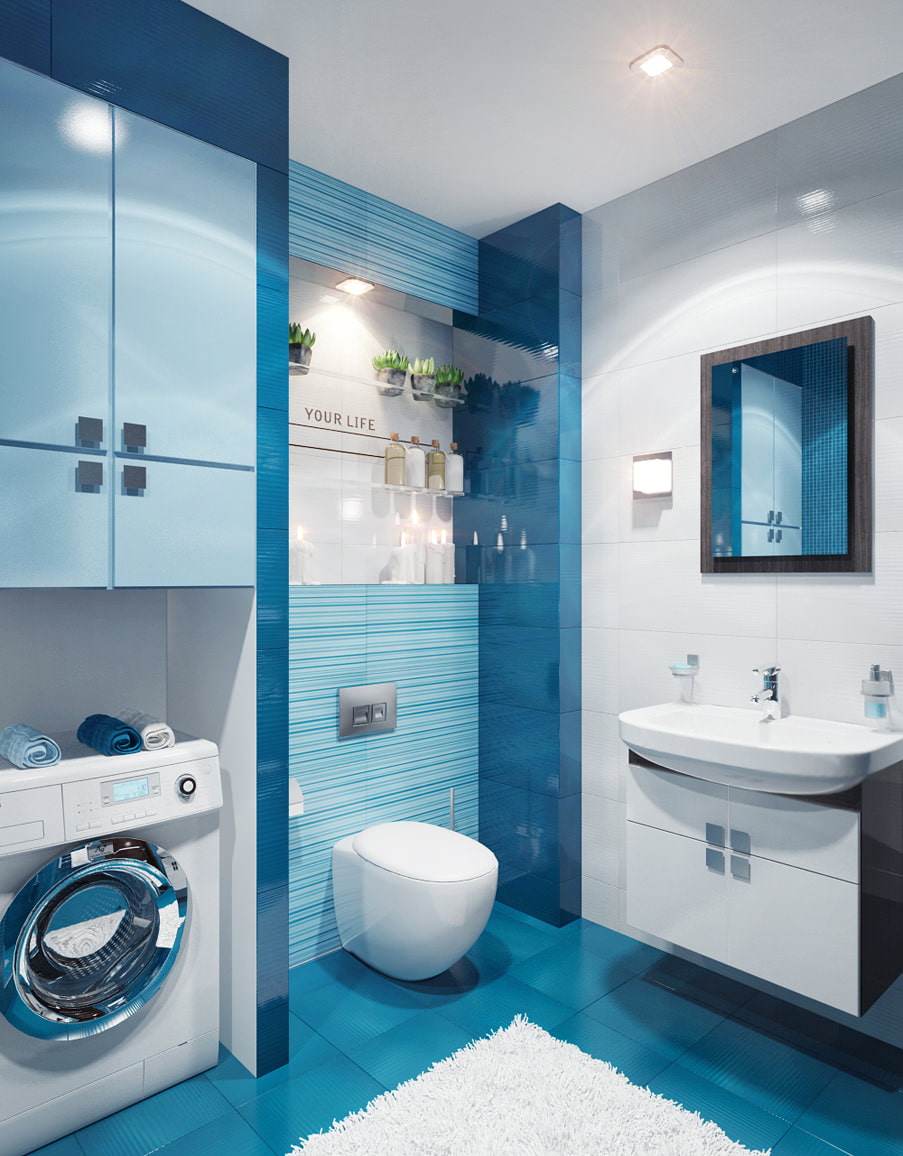 Blue combines well with turquoise, recalling the sea breeze and summer vacations. Bathrooms in these two colors are often found in nautical interiors.
