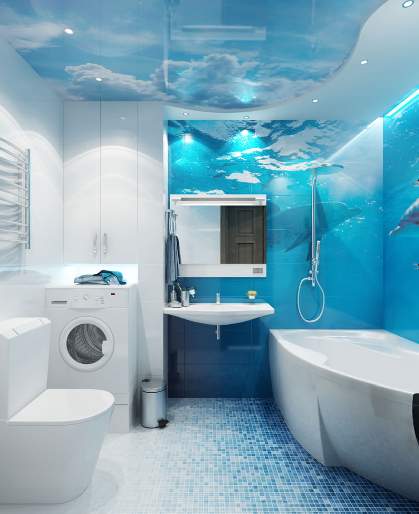 The design of a blue bathroom can be made in any style from classic to loft and minimalism. First of all, it is sea and Mediterranean, for which the theme of the sea and the beach is most relevant.