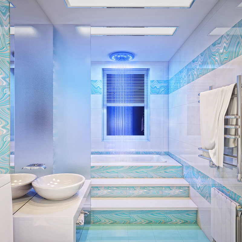 To prevent this from happening, let the sun into your bathroom in blue tones - arrange bright lighting at the appropriate light temperature. The darker the blue in the interior, the brighter your “sun” should be.