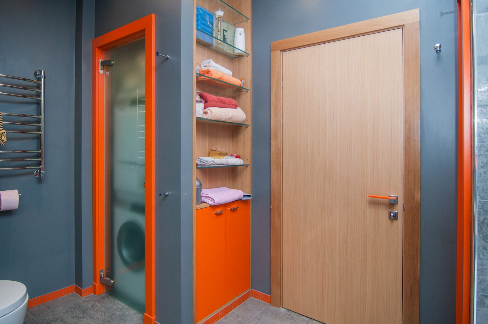 The photo shows bright accents in the bathroom
