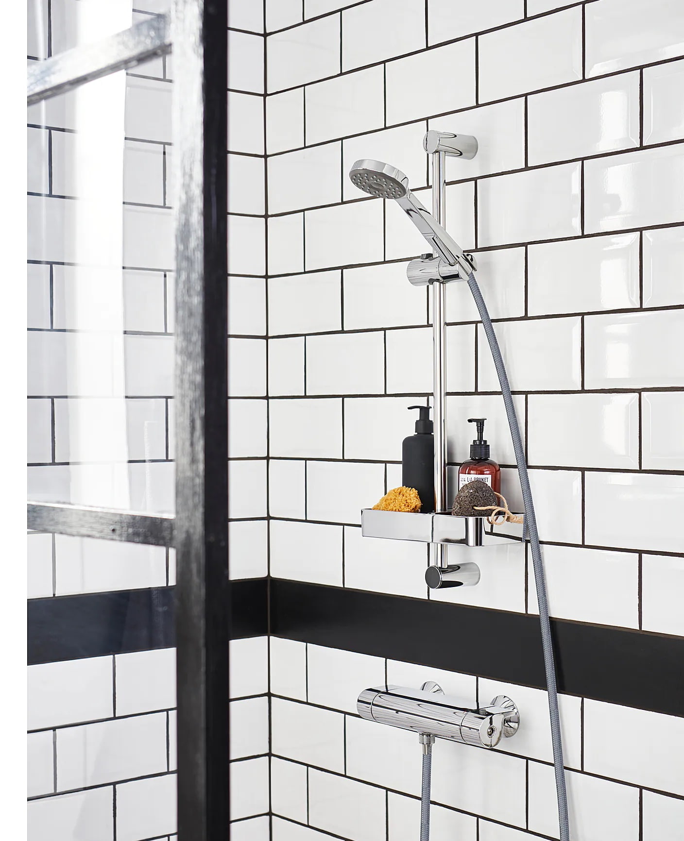 If the plastic product doesn't fit into your bathroom, look for a chrome shelf that will keep order and use space wisely. It is fixed to the shower bar and, thanks to the adjustable mount, can be positioned at any height.