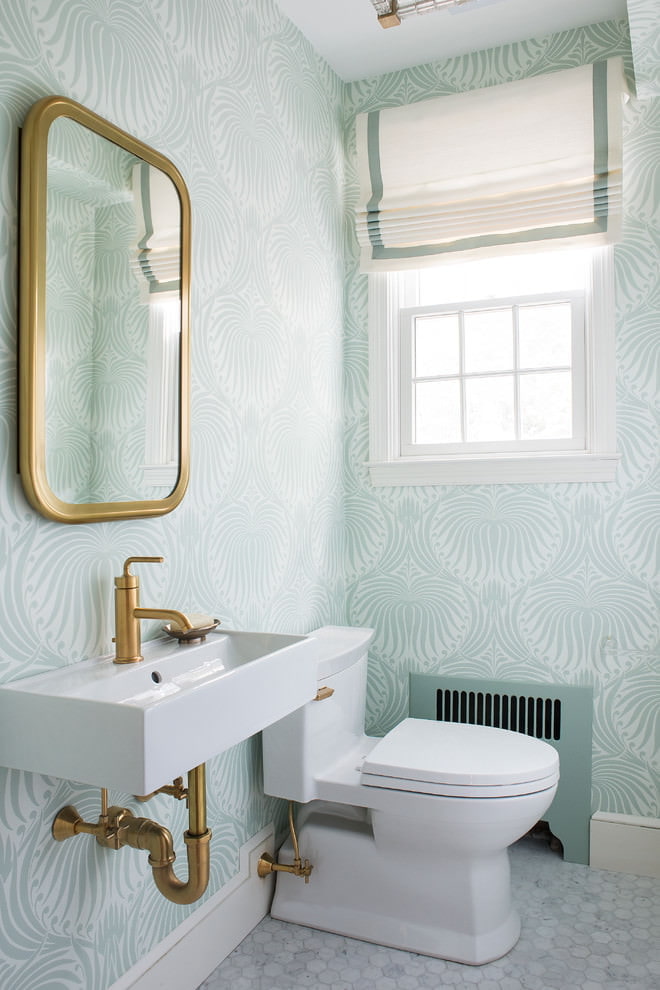 Designs can be floral, patterned, or geometric. You can also paste over with wallpaper in different colors, for example, green and white wallpaper to visually increase the interior of a small toilet.