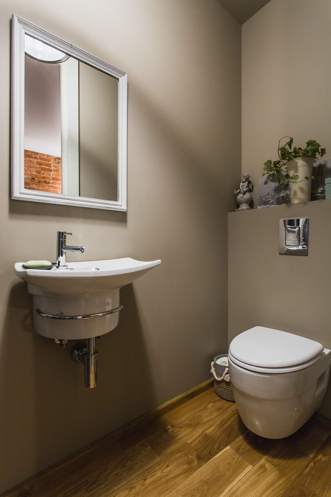 A loft-style toilet is most often plain white or gray, sometimes with brickwork, simple small lamps, and a matte floor.