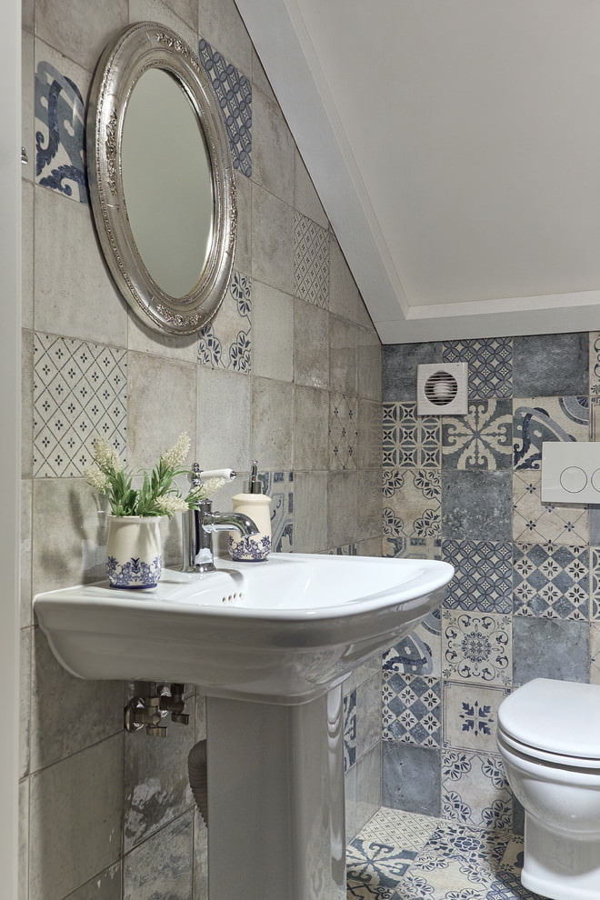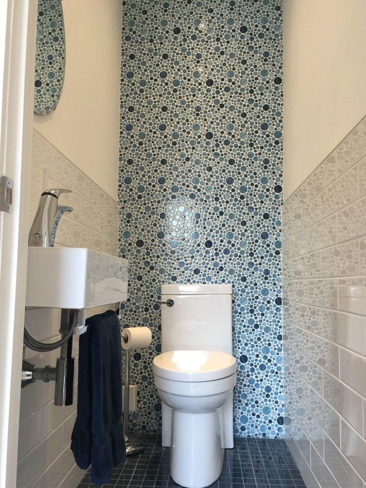 Blue is popular in combination with blue, white, emerald, black. Tiles, toilet, lighting can be blue.