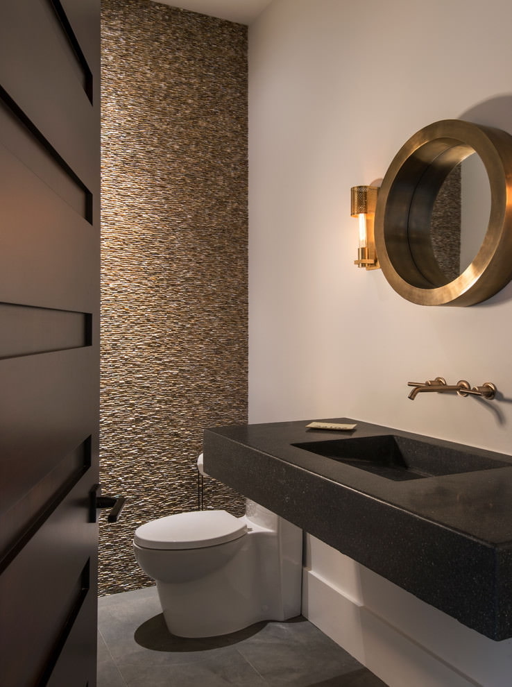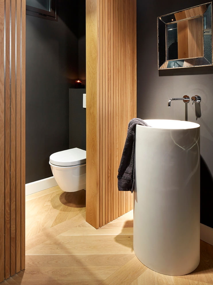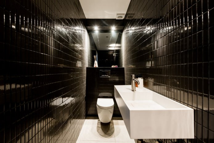 The black and white interior of the small toilet is combined in contrast. The ceiling and floor can be white, and the walls are tiled in black and white herringbone or in a checkerboard pattern. Combinations and proportions vary in different ways.