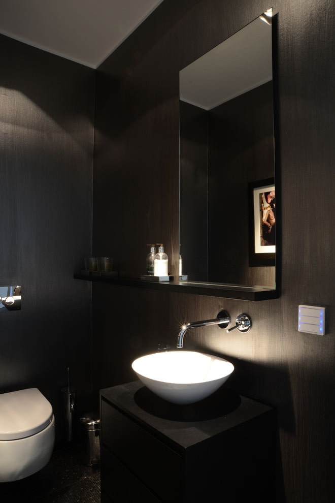 On the picture snow-white sanitary ware and glossy black decorative tiles create an organic look for the interior, where cold lighting plays an important role.