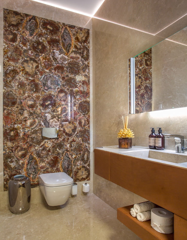 On the picture a combination of basic, niche and decorative lighting in a small bathroom in a brown-beige interior.