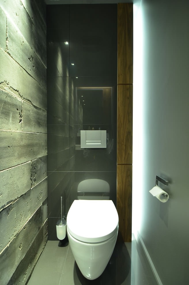 - Instead of cabinets for storing cleaning and disinfectants, use a niche above the toilet.