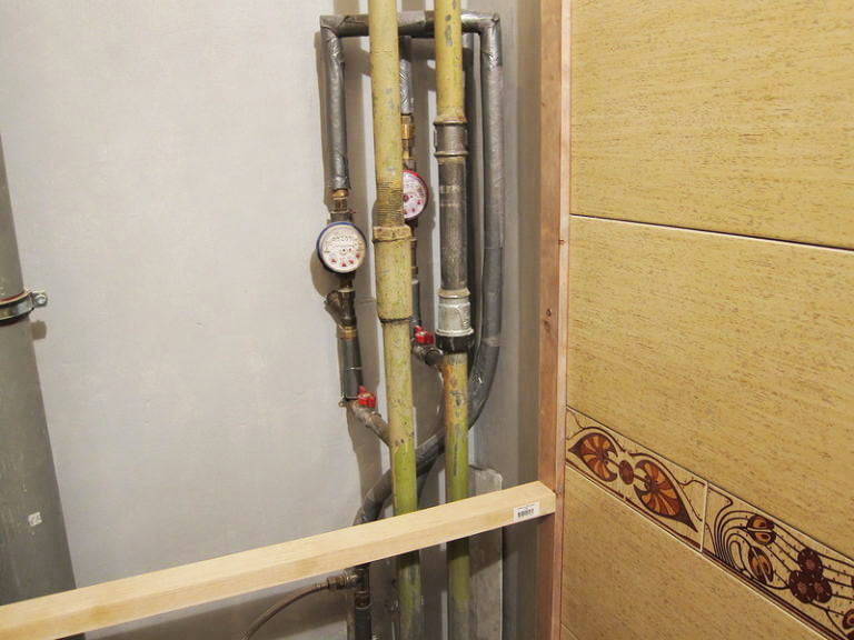 In the photo, bright blinds located at a corner successfully hide communications. In an emergency, they will instantly shut off the water supply.