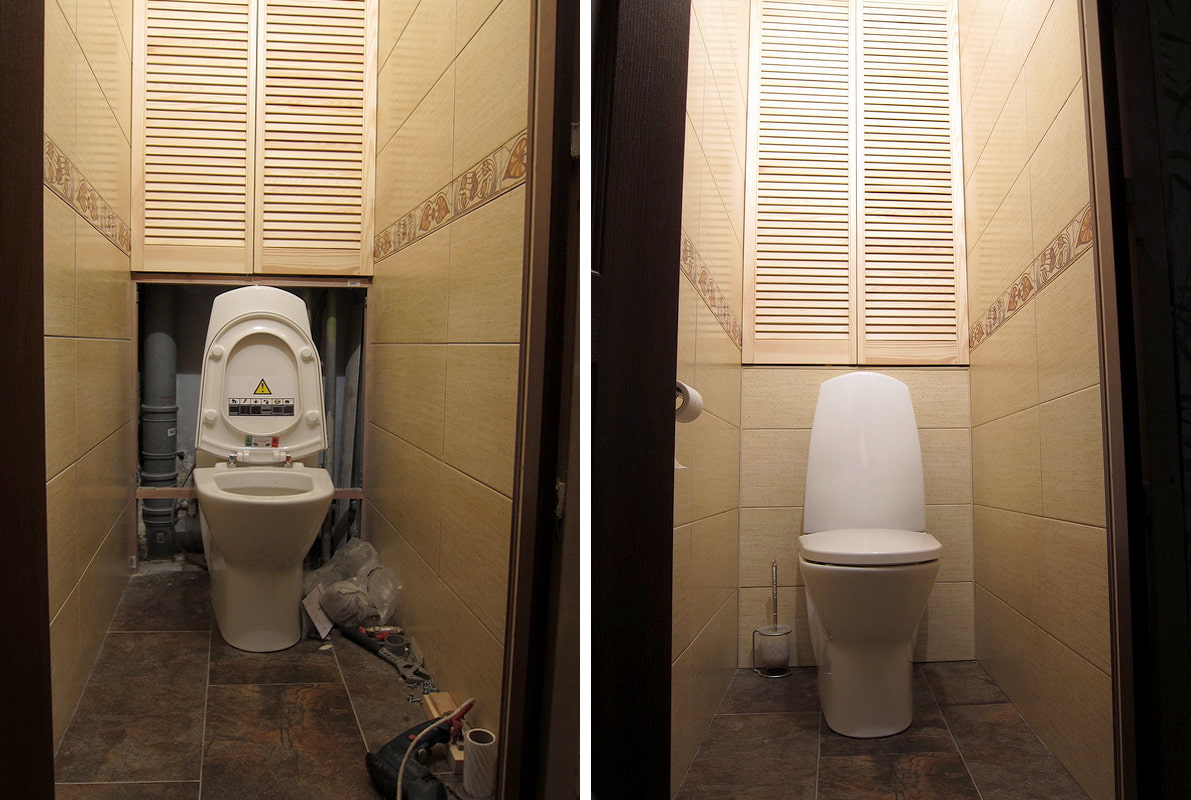 - If the closet for the toilet is made of wood, the material should be impregnated with a moisture-repellent compound or varnished. Stain is also used: you can use different shades to make the cabinet more original.