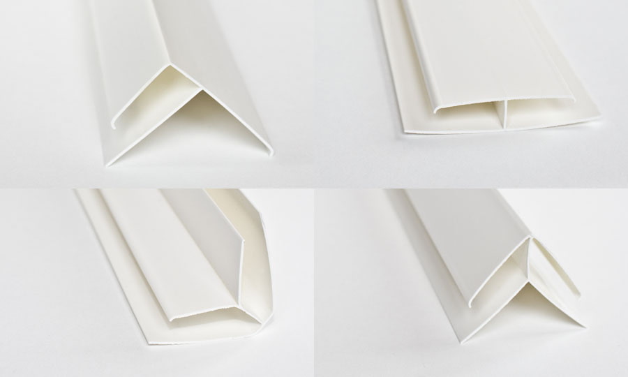 The photo shows fittings for plastic panels: finishing profile, connecting profile, inner corner and outer corner.