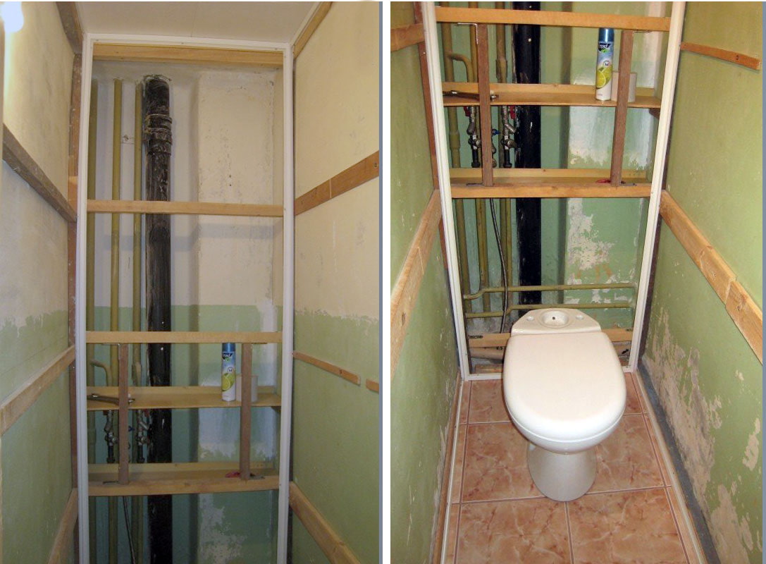 The pipes can be partially sewn up, giving the box almost any shape (for example, leaving space for a sink and a tap, going around a water heater) or erecting an overall structure.If the pipes are on the side or in the corner of the toilet, creating a box is the best choice, since the installation will leave a lot of free space.