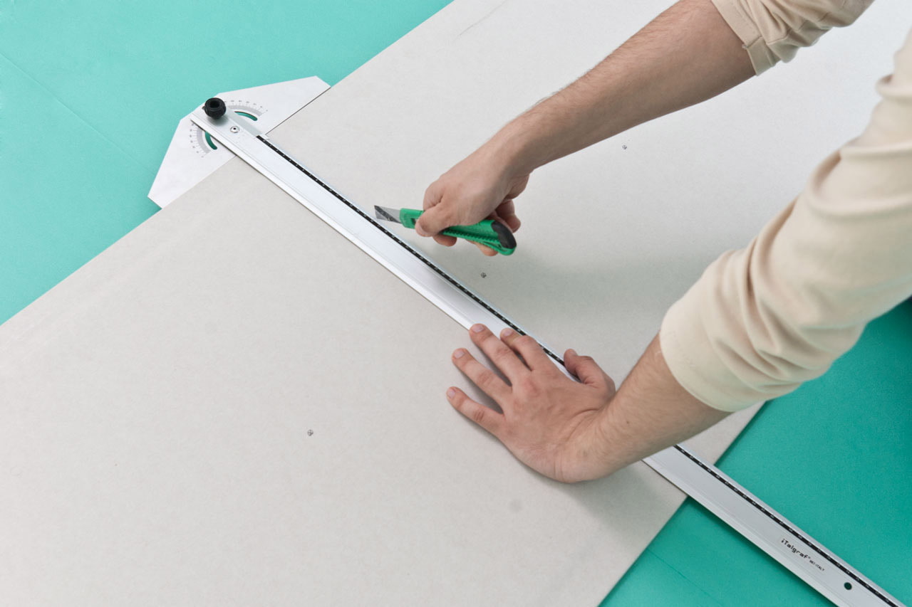 - We cut out the material: with a knife we cut a layer of cardboard, slightly deepening the blade into plaster. Gently bend the sheet and cut from the opposite side.
