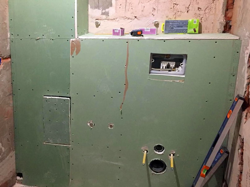 In the photo, a box made of moisture-resistant plasterboard with a communication hatch and porcelain stoneware cladding.