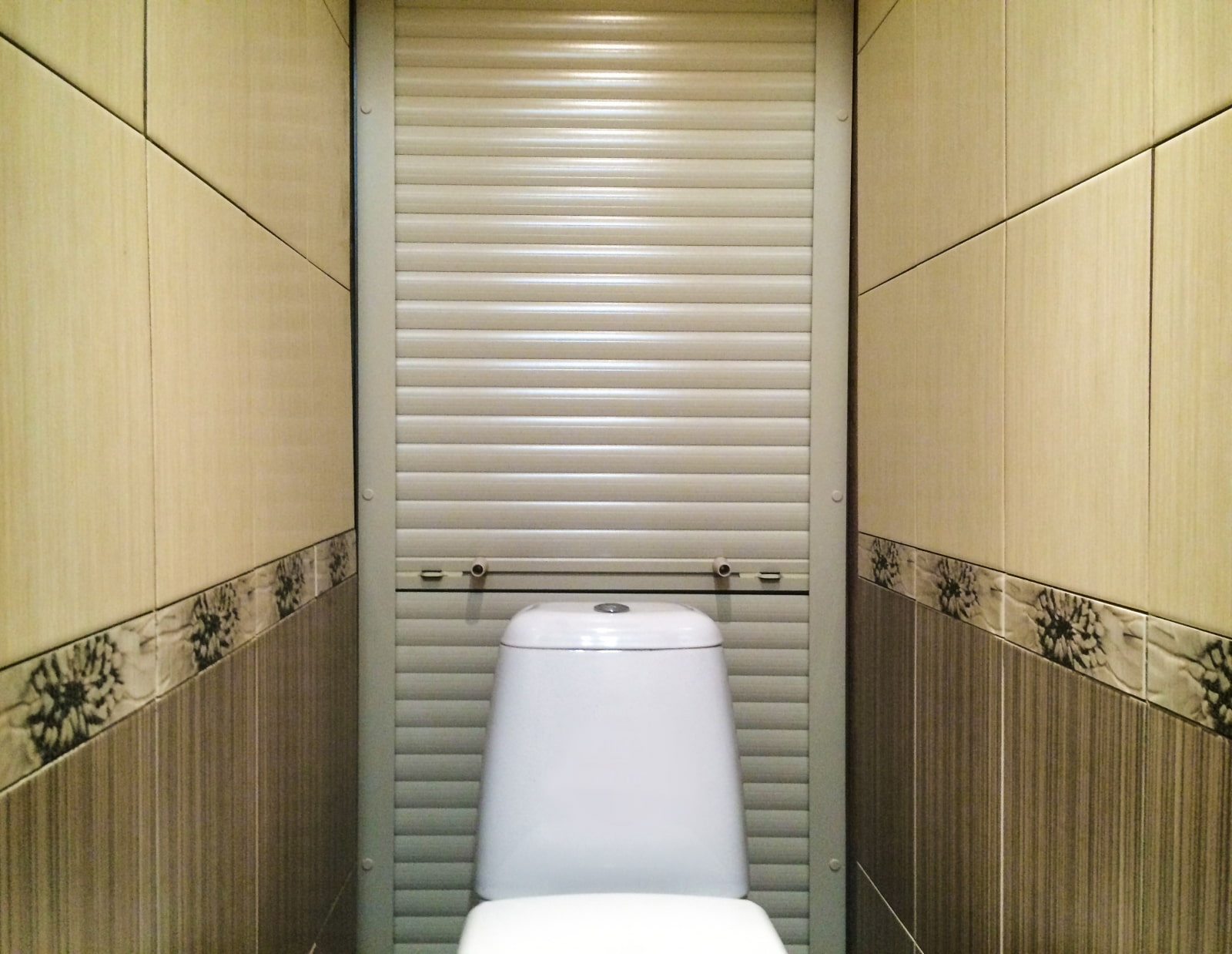 Another modern way to mask pipes in a toilet is roller shutters (or blinds), which were previously installed to protect entrance doors from burglary. Today, these structures are more widely used in the house and perform the following functions: they close the closet on the balcony, hide the sewer pipes and are even used as a door to the closet.