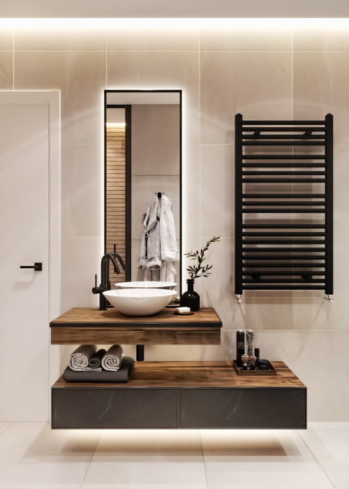 In most cases, the bathroom must have a vanity unit - this is a universal piece of furniture that allows you to rationally use space and hide communications. A sink with a cabinet is purchased together or separately, the sink can be either built-in or tabletop.