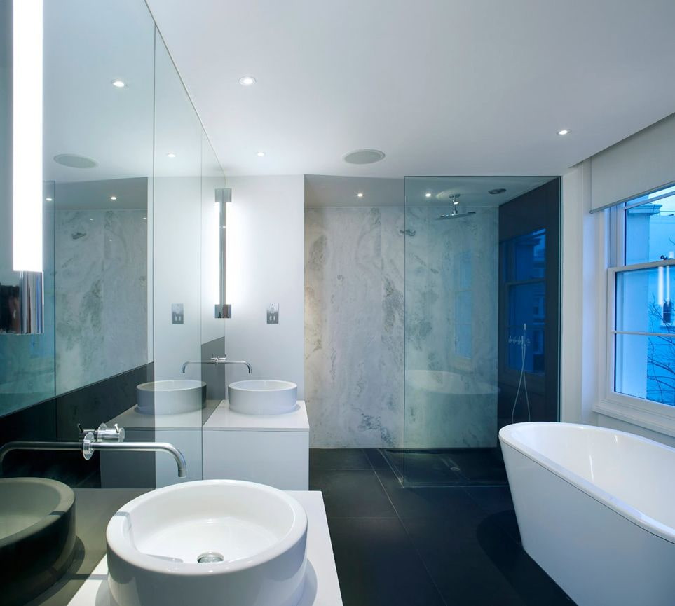 - Soaring, for example, will solve the problem with the reduced height of the bathroom. Perimeter lighting creates a sense of height.