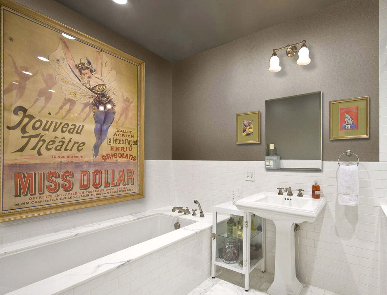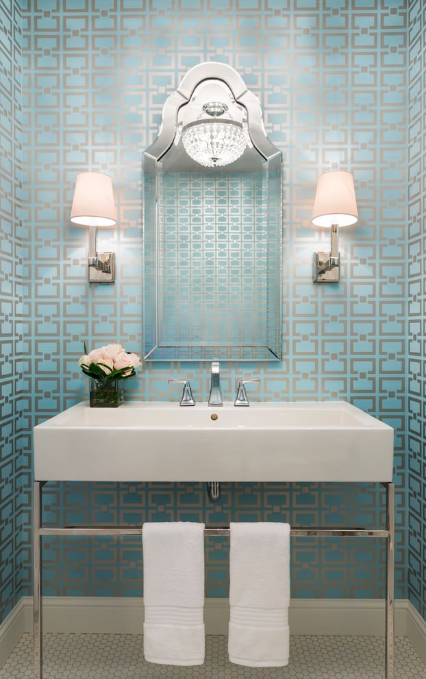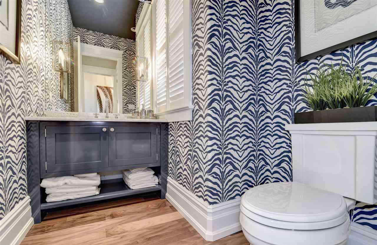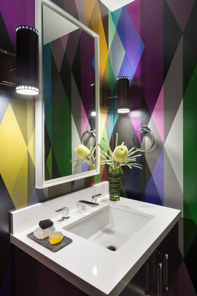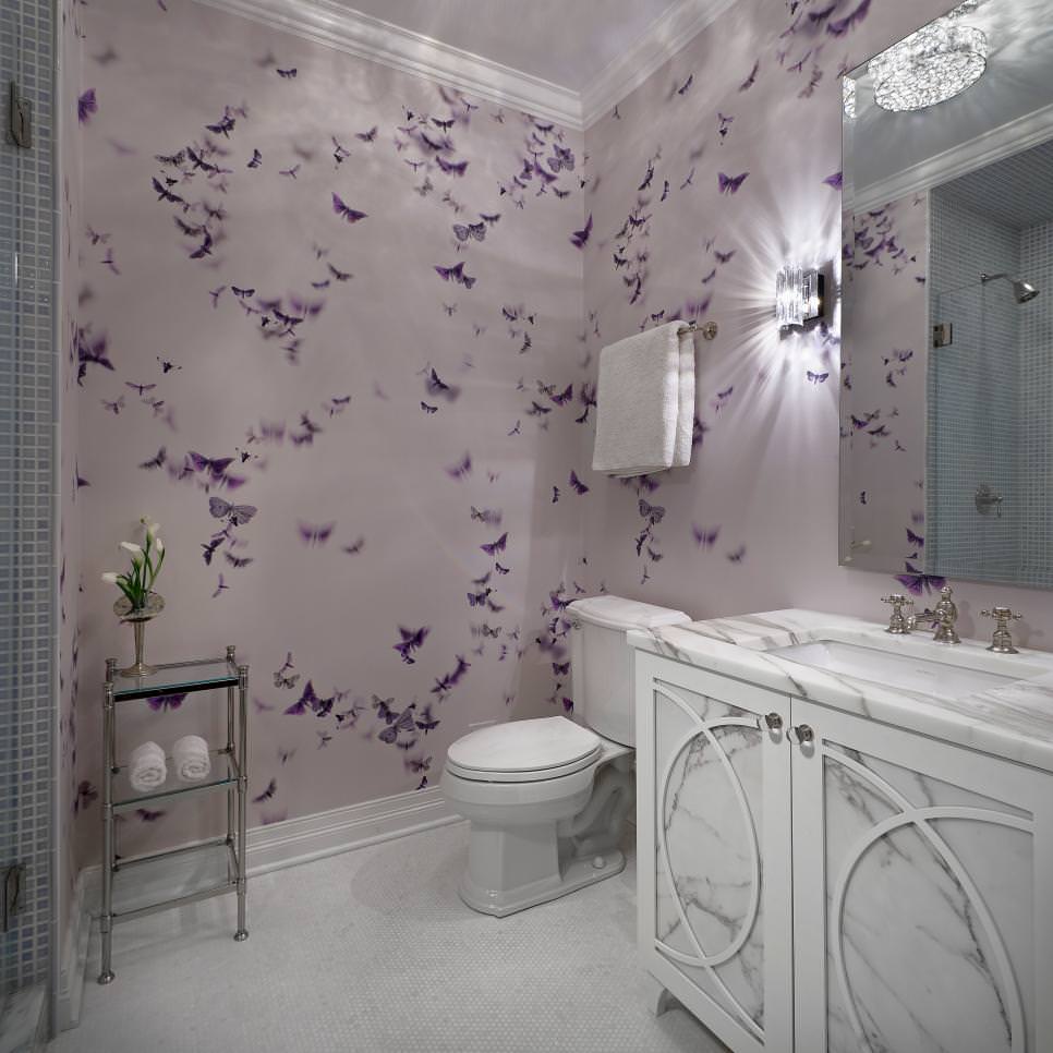 Below are photos of finishing the bathroom with wallpaper of different styles, options for combining them with the design concept and functionality of the room.